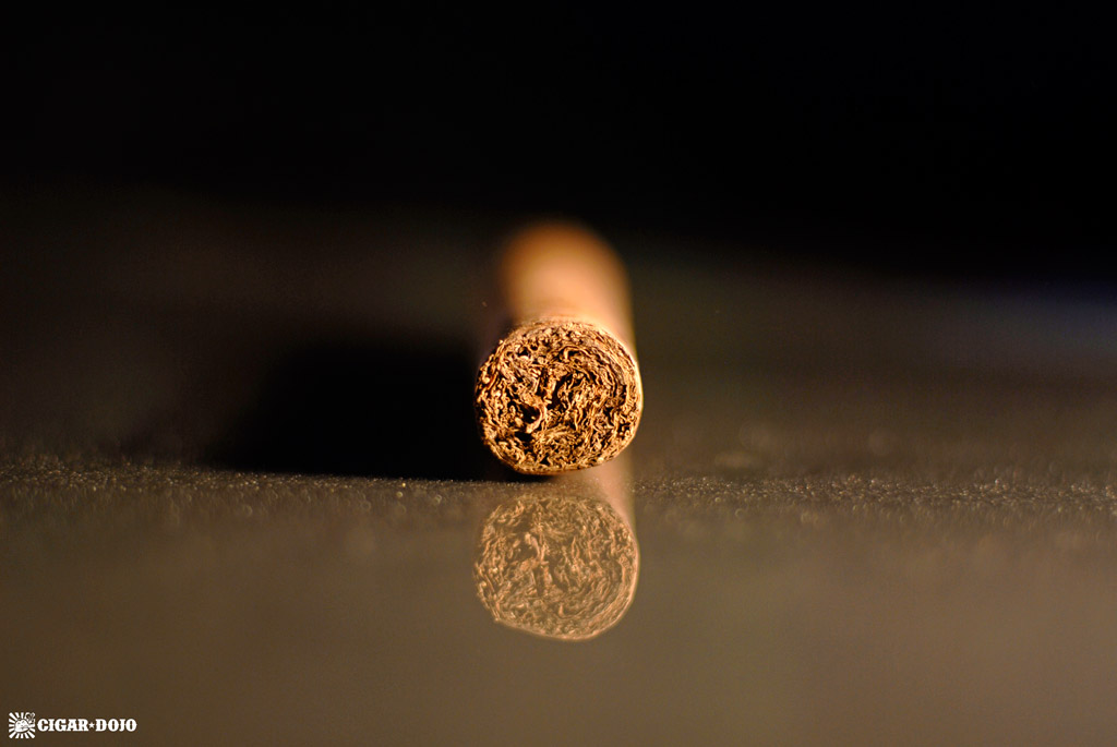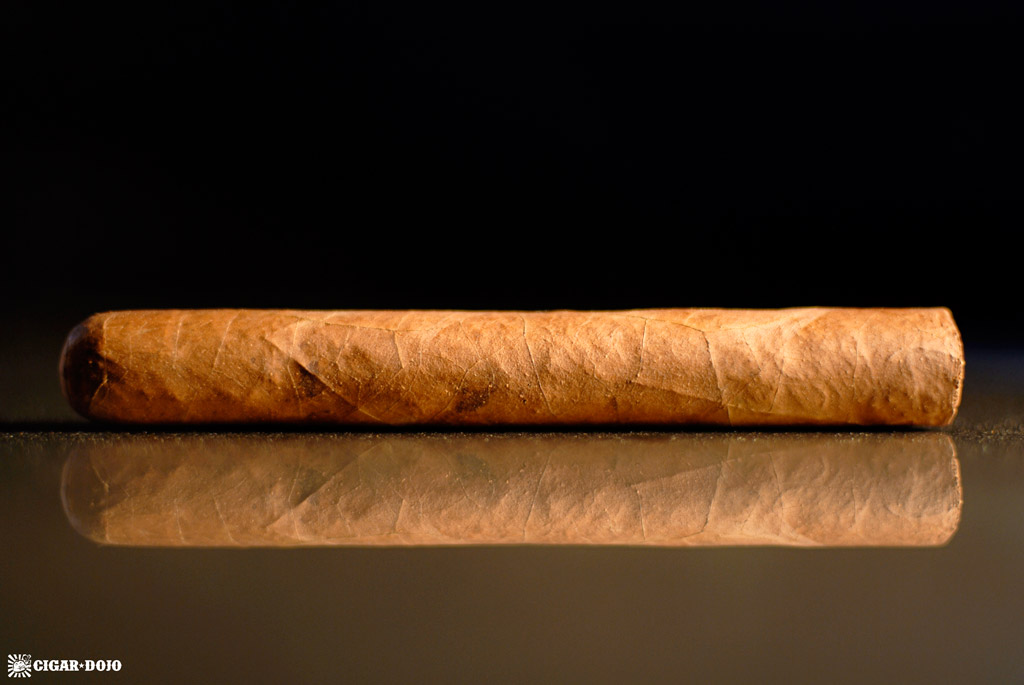 When attempting a straight cut, the delicate Costa Rican wrapper didn’t handle it too gracefully. With a good amount of shoulder damage, the wrapper quickly showed signs of weakness. Pushing past the annoyance, a brilliant draw signals cold notes of cedar and horse hide. Once things got hot, a spicy kick of flavor—cedar, pepper, and musty soil—burst forth with intense smoke.
