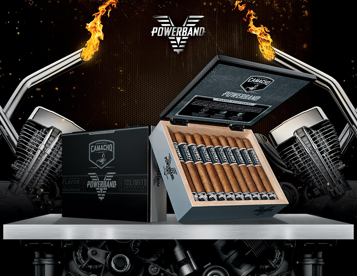 Camacho announced today the release of a new cigar line named “Powerband™”. Gear-heads and motorcyclists will appreciate it’s homage to the V-twin engine and marketing to match. This cigar promises to be a full-bodied smoke continuing Camacho’s theme of bold cigars.