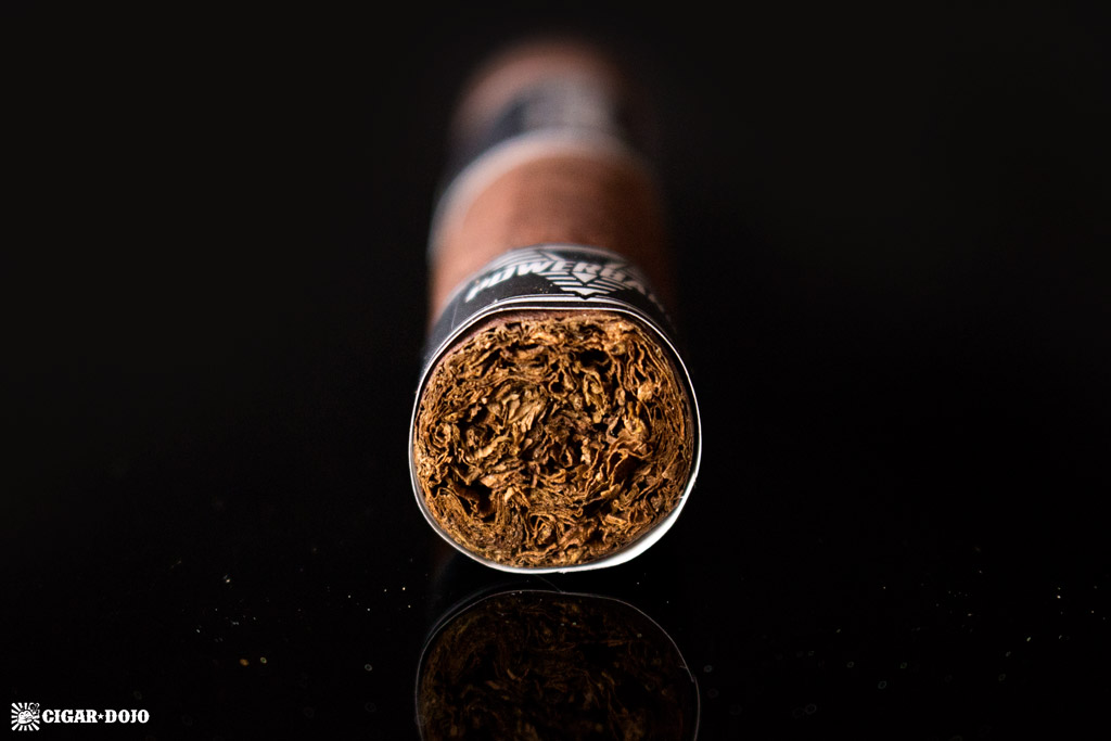 Lighting up, the first thing I tried to home in on was the draw. It’s nice, very smooth and just a tick under medium. This produces a medium-plus volume of smoke on each puff—so, no “wow factor” but it’s still a pleasing experience. The flavors are of leathers and woods, having a distinct cherry oak on the forefront. With the draw, I found smaller puffs produced better, more complex nuances. Larger puffs are almost overkill in the flavor department, hiding the subtleties with a more one-noted, booming experience.