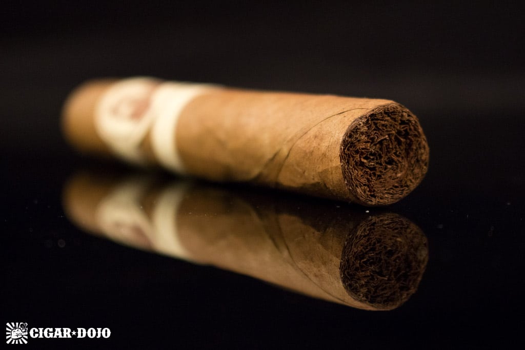 The Connecticut wrapper is not the exemplar look of silky smooth, golden perfection of the prized Connecticut leaf. Instead, the wrapper has a dusty look, with a very slight green tea shade and a fuzzy feel between the fingers. Construction-wise, it’s not quite as “spot-on” as expected, with somewhat loose seams and a soft spot or two. The wrapper is not consistant, with dark streaks running down the length of the cigar. It feels about medium bunched, with a slightly lighter weight than expected.