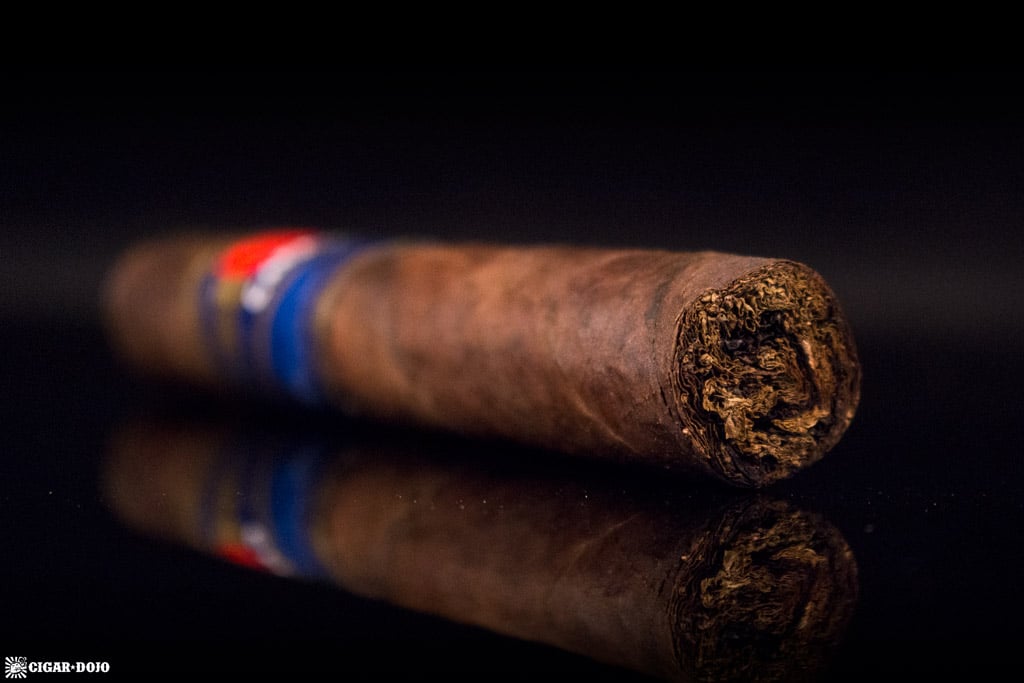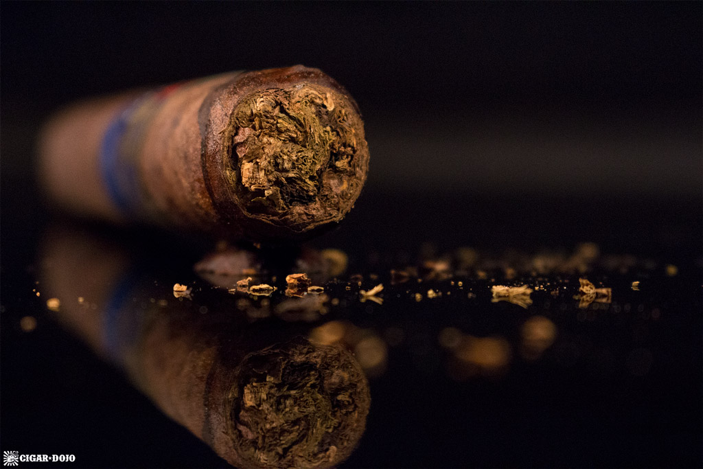 After the cap of the Dusk is opened with a double guillotine cut—to ensure the maximum amount of taste from the wrapper, binder, and filler—the initial cold draw is firm and a bit resistive. Flavors of cedar, coffee, earth, and leather immediately touch the palate, while a slight amount of spiciness formulates on the upper and lower lips