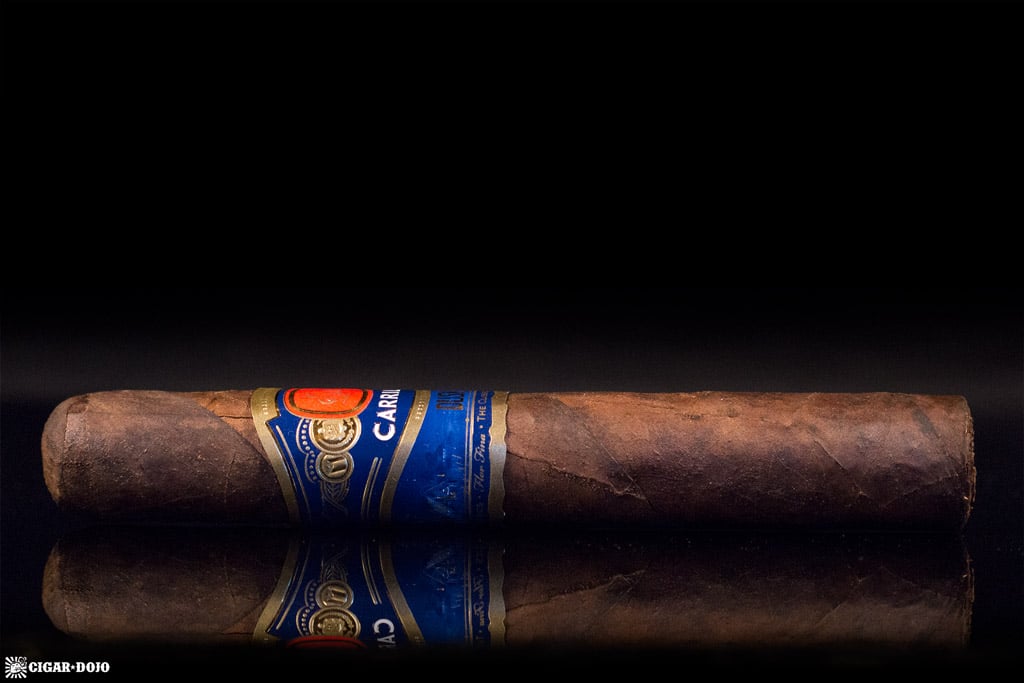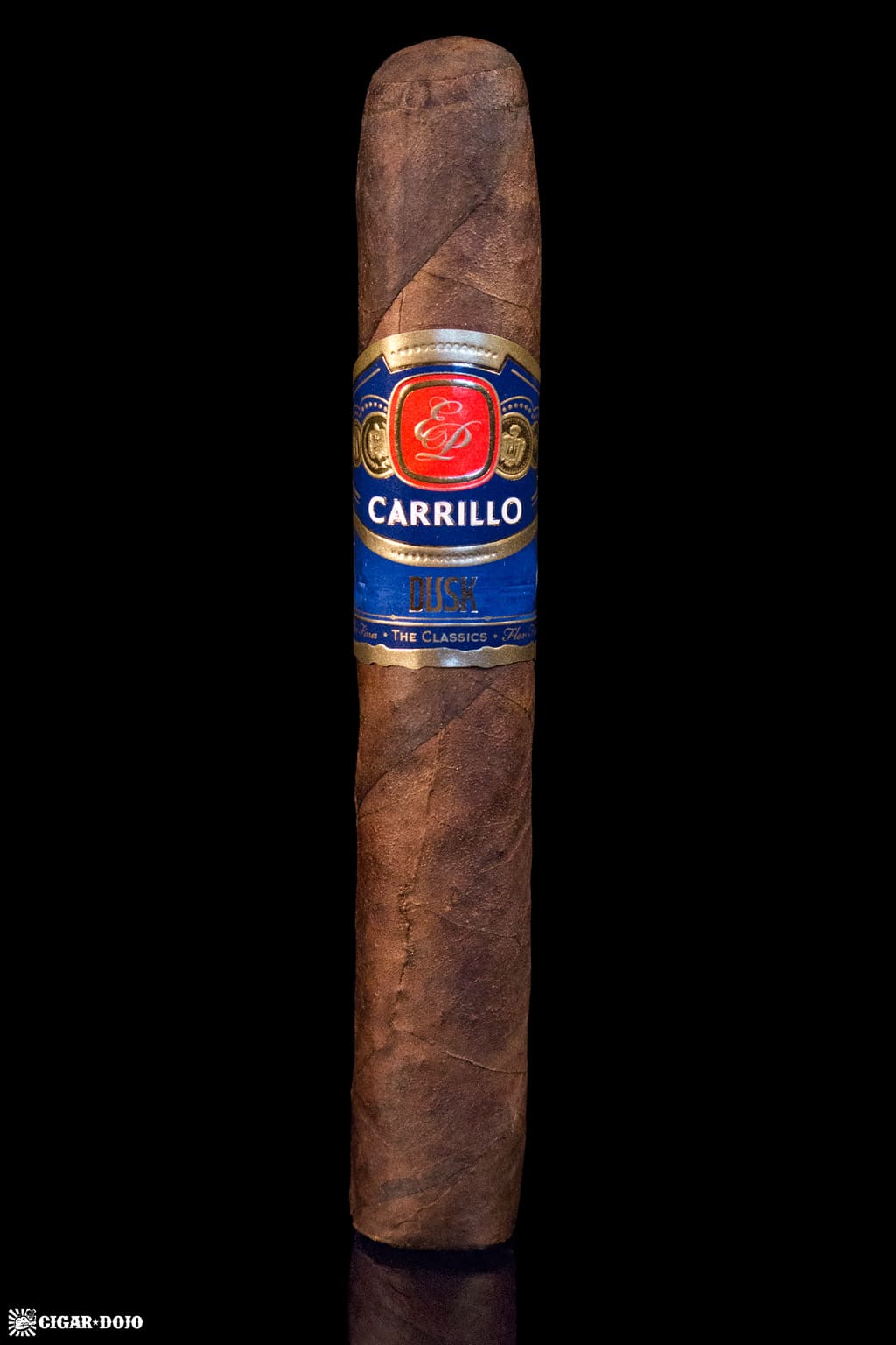 The cigar is encased with a lightly embossed band printed in the colors of black, blue, gold, and red. The red and gold “EP” logo resides in the center and is flanked on each side by golden medallions and scrollwork. Underneath the logo is the word “CARRILLO” printed in white with gold outlines on the individual letters. The bottom of the band identifies the blend as the Dusk. Very firmly packed from the foot to the cap—with one small soft spot beneath the band on the right hand side—the wrapper aroma combines natural tobacco and tilled earth along with a subtle sweetness, although the open foot smells of barnyard, hardwoods, and spices.