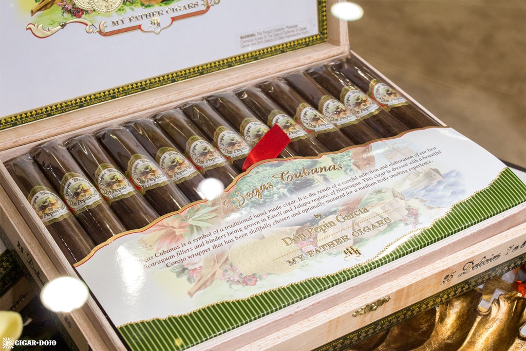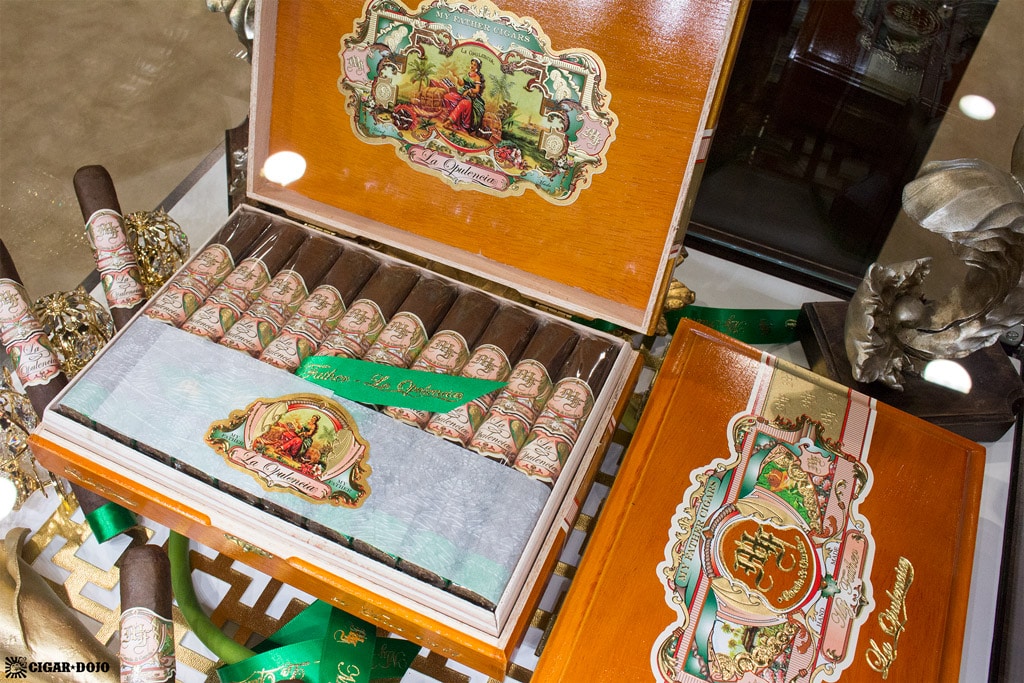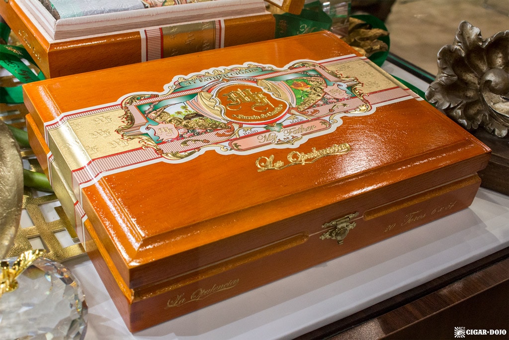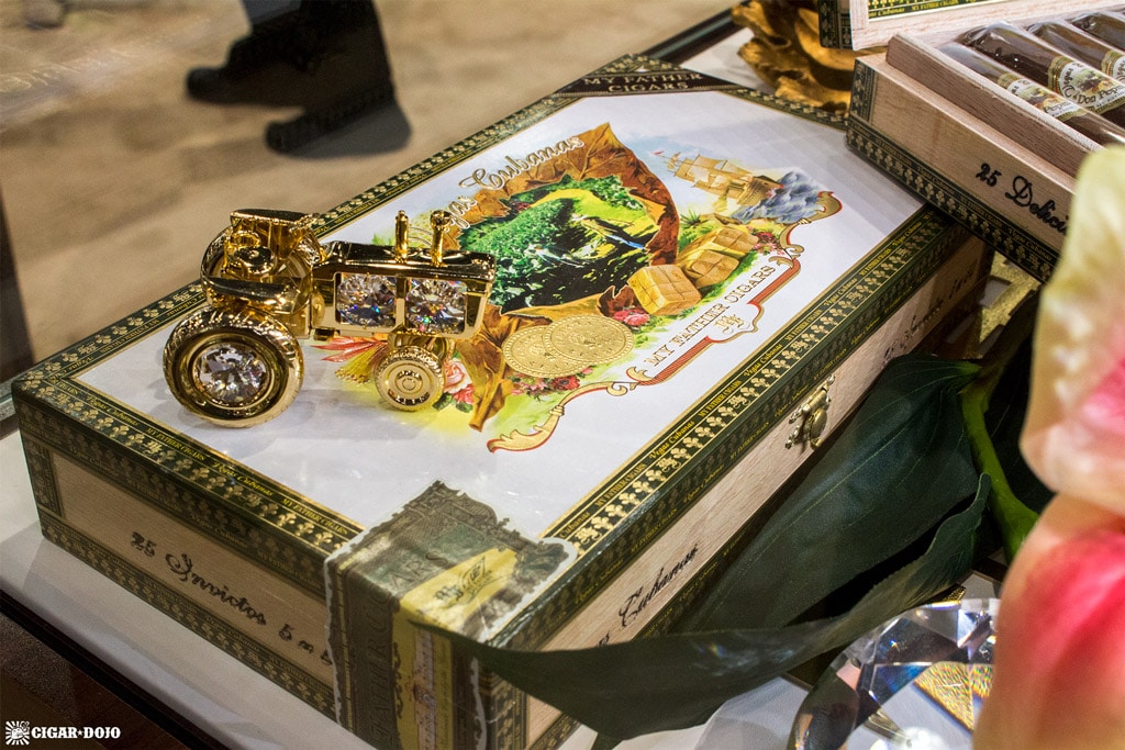 I have been attending the annual IPCPR trade show since 2013 and, apart from shedding partner brands Tatuaje and L’Atelier (both expanded to their own booth in 2016), the My Father Cigars booth has not changed. The look is both old-school and classy, like a recreation of a luxury cigar shop contained within the trade show floor. Wood, glass, and ornate ribbons and gold trimmings complete the ambiance—it’s the physical manifestation of every My Father cigar rolled into “booth format”.