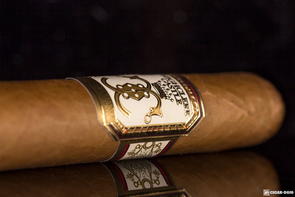 As could be expected from the cigar’s background, Highclere Castle is positioned in the ultra-premium market, and the look follows suit. The cigar’s boxes show vibrant colors of royal blue, gold, and lacquered wood, bound in the Foundation Cigar Co. seal. An imag of the castle is depicted in gold foil on the box’s lid and engraved once more on the lid’s underside. The cigar’s band bears the company’s crest-like logo, designed in gold ink and embossing over a cream backdrop. The look is regal and fitting for a project of this caliber.