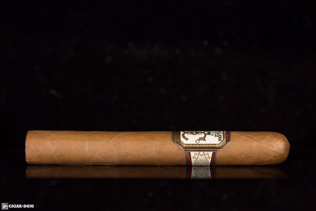 The toro shows an extremely uniform bronze hue across the wrapper, with well-placed seams and faint veins. The build is very study, having the rigid construction of papier-mâché. The wrapper leaf’s texture is papery (slightly softer than a brown paper bag) and shows no signs of oils.