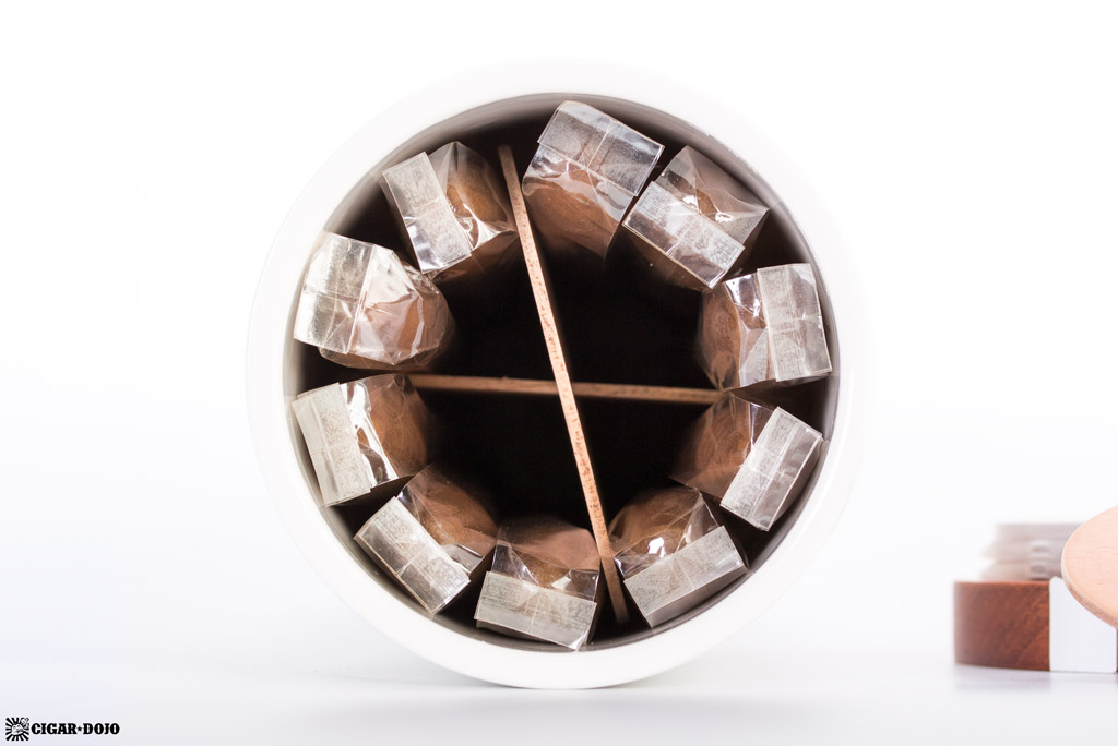 There’s no getting around it, this thing, from box to cigar, is an impressive specimen. The presentation begins with a white, lacquered cardboard box that mimics the jar’s artwork (i.e. the Les Ameriques design, in my case, is printed on the jar and outer box). The jar, a staple in upscale cigar presentation since the early 1900s, is crafted from porcelain and is fitted with a wooden lid. Containing only 10 cigars (as opposed to the usual 19 to 25), the Diademas Finas jar is one of the most slim and compact I have come across. It’s a nice change of pace from the ornate and shapely jars consumers are accustomed to, having a clean and modern feel, tapering just before the jar’s underside. The wooden lid provides a nice contrast against the clean white and has a certain mid-century modern feel to it. The lid is also fitted with its own humidification device on the underside (as any premium jar should), allowing you to convert the jar into a functioning humidor. Davidoff has employed an interesting use of cedar on the interior, with slotted pieces running down the center of the jar, jutting out between the cigars to keep them firmly in place.