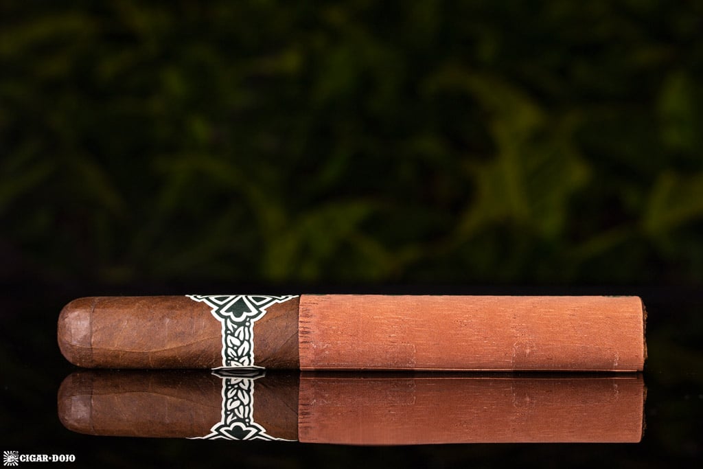 Sin Compromiso is an impressive specimen; with the cigar’s bold band, cedar-lined foot, and soft-pressed shape, it has the look of luxury. The packaging is dark green, using a matte finish and rounded corners on the cigar’s wooden box—it’s simplistic but elegant. I’m not quite sure if I’m fully on board with the cigar’s band; it uses a Hungarian cross, often symbolizing fidelity, faith and passion. But instead of the metallic foils one would expect of a cigar in this price range, Sin Compromiso offers dark green (nearly black) and white, printed on semi-gloss paper with a die-cut shape. Attaching the face of the band to the rear is a thin connector, built like a vine of tobacco leaves that has threaded the two together—this is a nice touch.