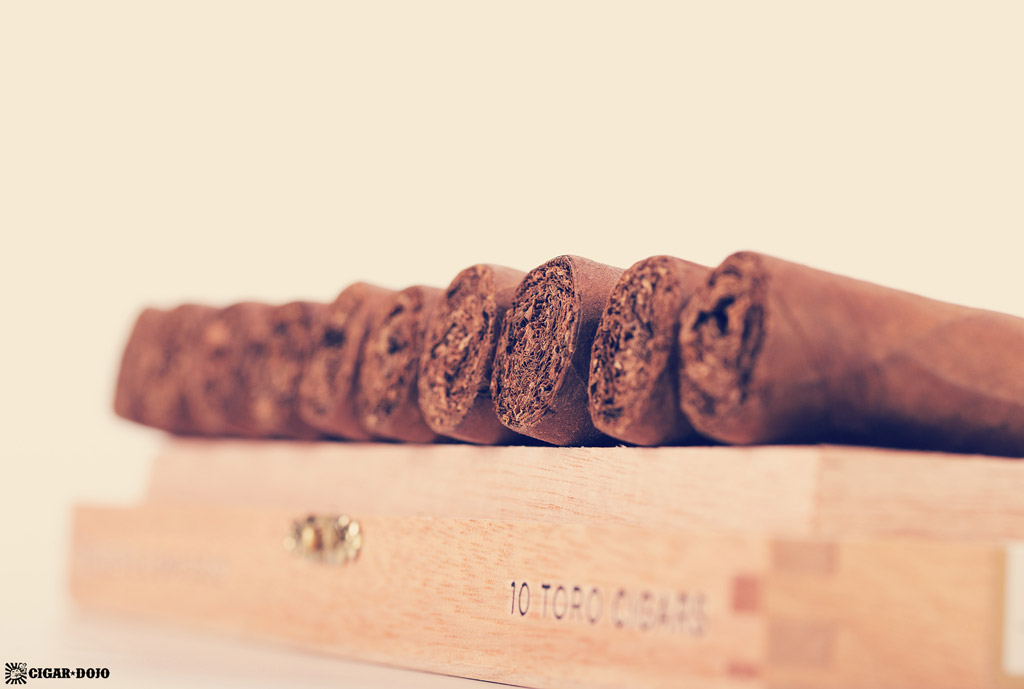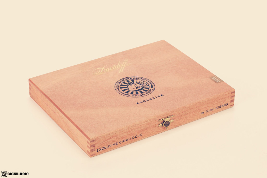 Being Cigar Dojo’s most expensive collaboration to date, packaging was stripped down to a minimalistic format (for Davidoff’s standards), allowing the cigars to showcase Davidoff’s top-tier tobaccos without entering the $25 to $35 price range. The cigars are rolled in a singular toro vitola chosen by Eladio Díaz and packaged 10 to a box. Each wooden, hinge-lid box showcases the Cigar Dojo *Insignia* logo on the box lid, as well as the standard Dojo logo on the lid’s interior. Only 5,000 cigars have been rolled, with each box of 10 cigars (500 total) offering a numbered seal.