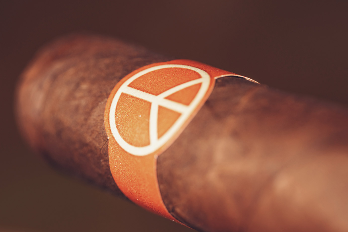OneOff is packaged in simplistic, slide-lid boxes of 10 cigars, brightly displaying the “peace sign” logo in a manner that invokes “hazard symbol” warning signs. This is likely the intent, with Illusione being steeped in conspiracy culture and based not far from Nevada’s infamous Area 51. The cigar’s bands differ from Illusione’s usual thin, straight labels; instead, the band is round and features the peace design in cream with a pastel-like salmon base color.