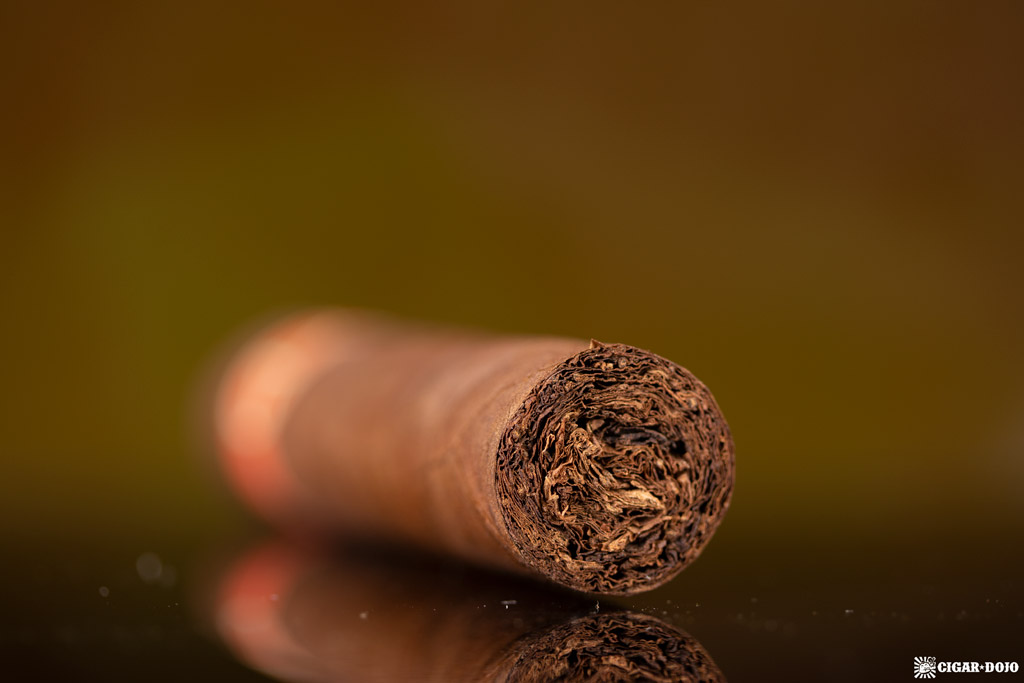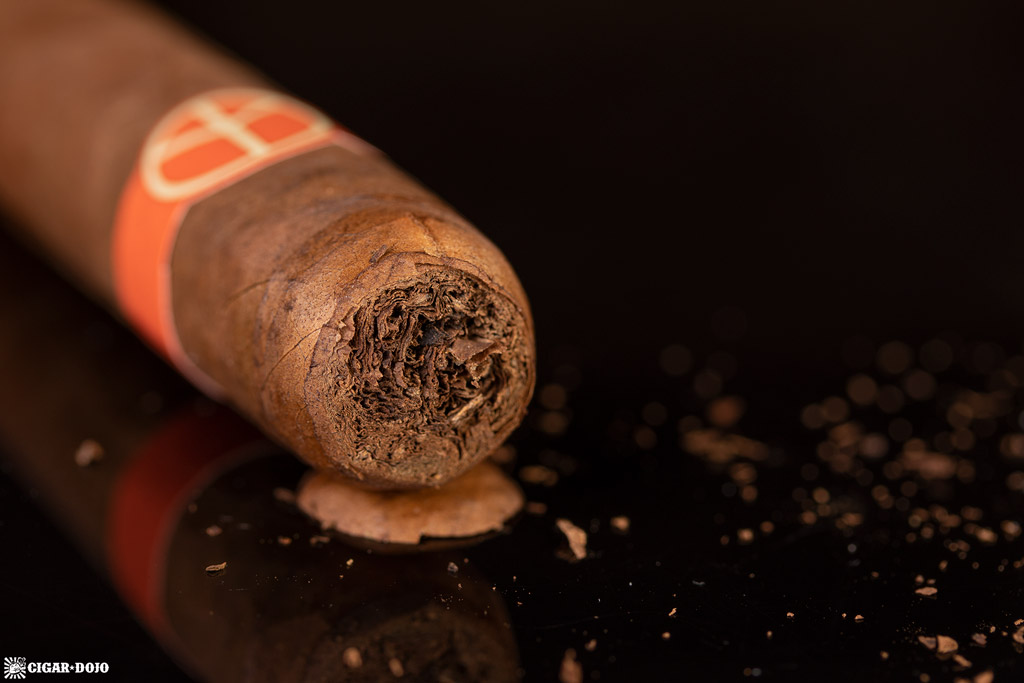 The cigar is rolled in a traditional robusto format, which is slightly shorter than the five-inch length commonly used toady. First examining the robusto, it has a slight fuzziness across the wrapper. There are visible, well-placed seams that lead to a loosely applied triple cap (being somewhat flat at its peak, continuing the cigar’s Cubanesque feel). A web of fine veins can be seen with a closer look, being so intricate that it could almost be compared to analogue television noise/snow (somewhat mesmerizing). Overall, OneOff seems to have a medium-firm bunch and feels fairly solid.