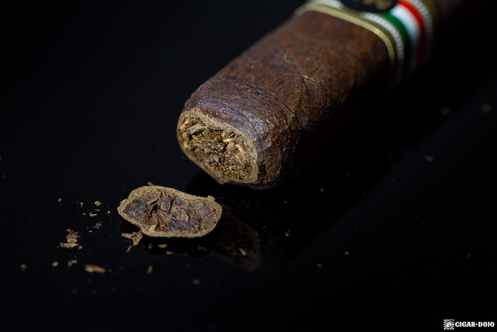 The Mexican San Andres wrapper gives off notes of deep earth and barnyard with a little leather. The cold draw tastes of milk chocolate, peppercorn, earth, and leather.