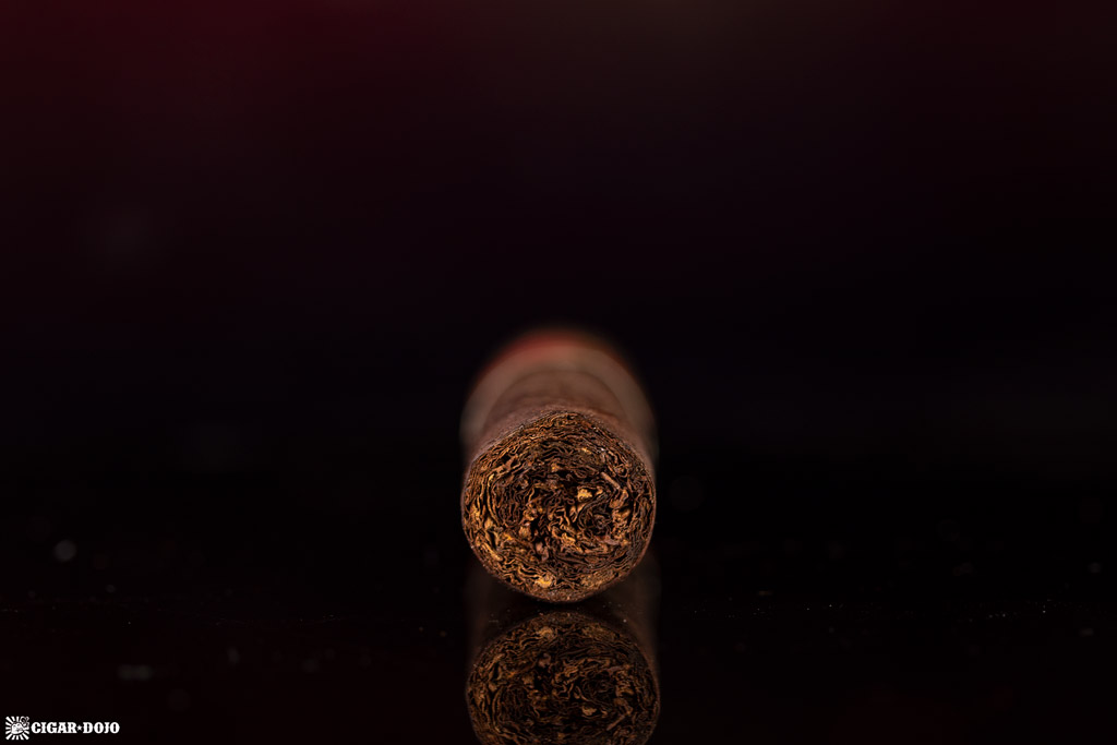 The wrapper is a dark contrast to the lighter brown fillers, giving the foot a pronounced look that draws the eye to what appears to be many leaves rolled entubado-style. On the opposite end sits a solid round head that looks to be double capped and applied as seamlessly as the wrapper.
