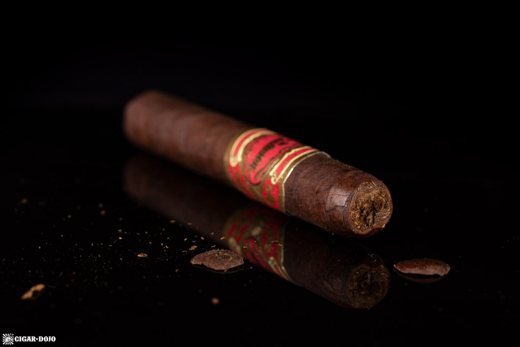 The ash is gray, with black lines showing each spot where I drew and stopped. It is also quite dense and solid, giving the appearance of a concrete pillar. At the halfway point of the cigar, the flavor is driven by chocolate and coffee, with a distinct syrupy note and an underlying presence of a medium-toasted oak barrel. Each of the flavors are very distinct and the Mexican dried chili component has subsided in the final third.