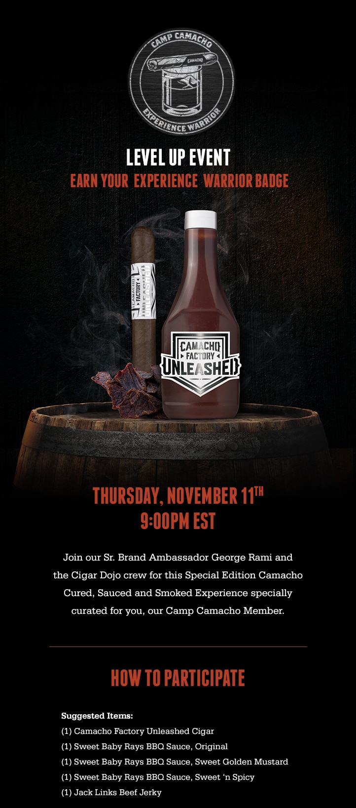 Join Camacho Sr. Brand Ambassador George Rami and the Dojo crew for a special edition Cured, Sauced and Smoked Experience curated just for the Dojoverse Camp Camacho Group members.