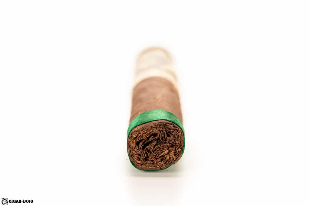 The Sumatra wrapper gives subtle, musty alfalfa notes, along with what I can only describe as a sweet chewing tobacco aroma. After giving the head of the cigar a haircut with my guillotine, I find pre-light draw notes of the same musty alfalfa, now accompanied with black pepper that lingers on my palate.