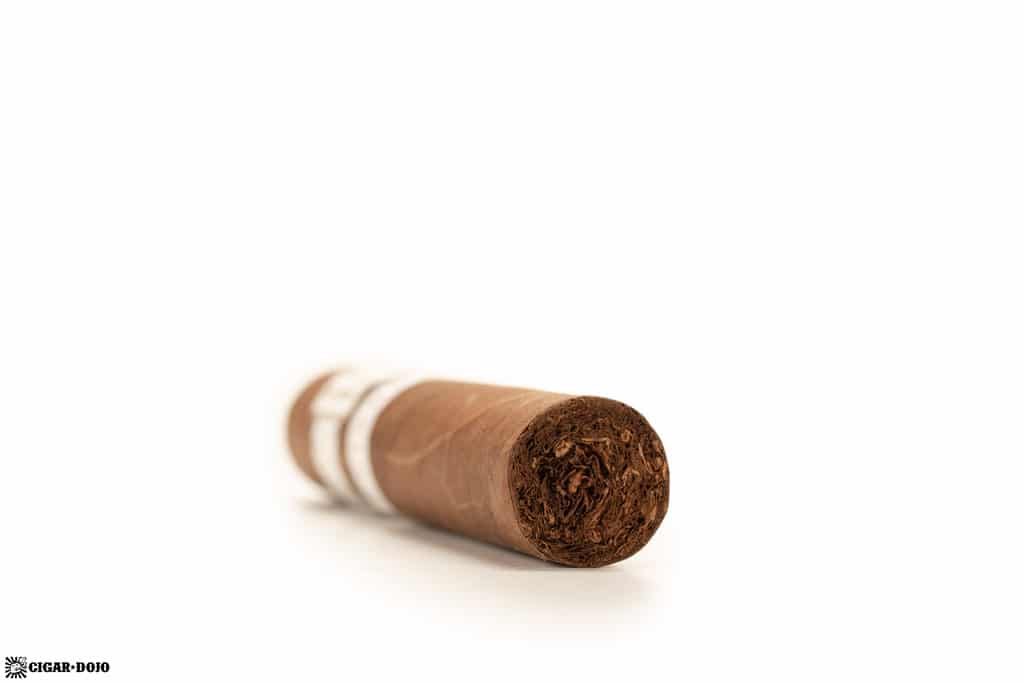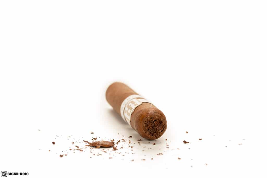 The cigar looks very well rolled, having light veins and tight seams that lead up to a triple cap. The wrapper is darker than your standard Habano, having a soft and fuzzy feel and showing virtually no oils. It’s a firm bunch, feeling like papier-mâché when squeezed. The wrapper gives off notes of sage, bell pepper, and light leather. Meanwhile, the foot brings earth, roasted nuts, and hay. The robusto gives a near-perfect draw with a straight cut, having flavors of sunflower seeds, cedar, and nutmeg.