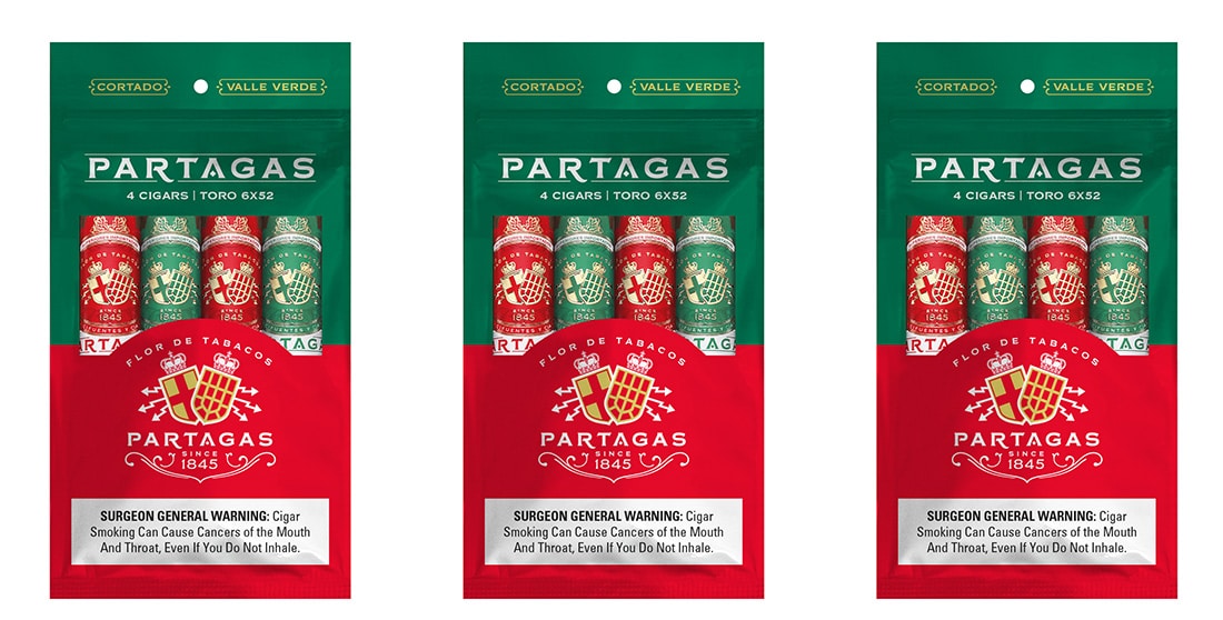 Partagas Cortado is wrapped in an Ecuadoran-grown Connecticut Shade and sits in stark contrast to the Mexican San Andrés of the Valle Verde. The Partagas Holiday Four Pack is shipping now to retailers and will sell for an SRP of $29.99 per pack.