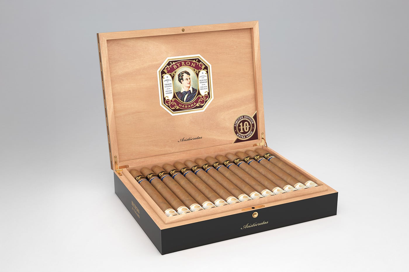 Packaged in 25-count black piano lacquer boxes, the Byron Aristocratas 10-Year Aged carries an MSRP of $43.50 per cigar. Distributed exclusively in the U.S. by United Cigars, this release adds to their portfolio, which includes brands like Red Anchor, Firecracker, and the luxury lines of Selected Tobacco such as Atabey, Byron, and Bandolero