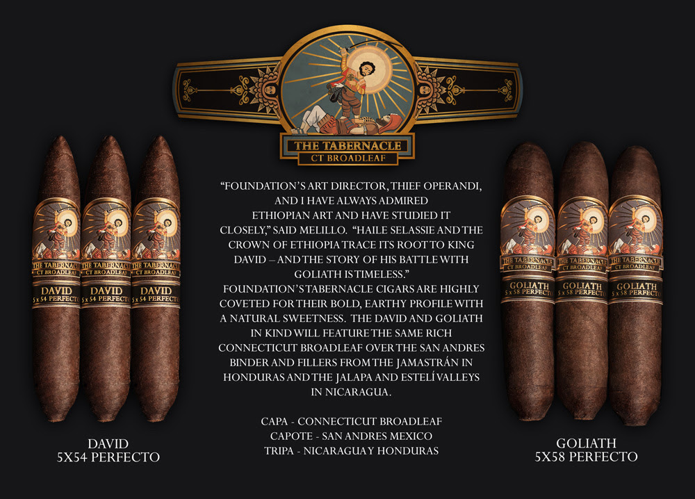 Nicholas Melillo announced his latest release, a two-size extension to the Tabernacle line, Melillo has again drawn on biblical inspiration to represent his life in tobacco and his commitment to the industry. Beginning next month, Foundation will begin shipping two new Perfectos: David (5 x 54) and Goliath (5 x 58) in 25 count boxes.