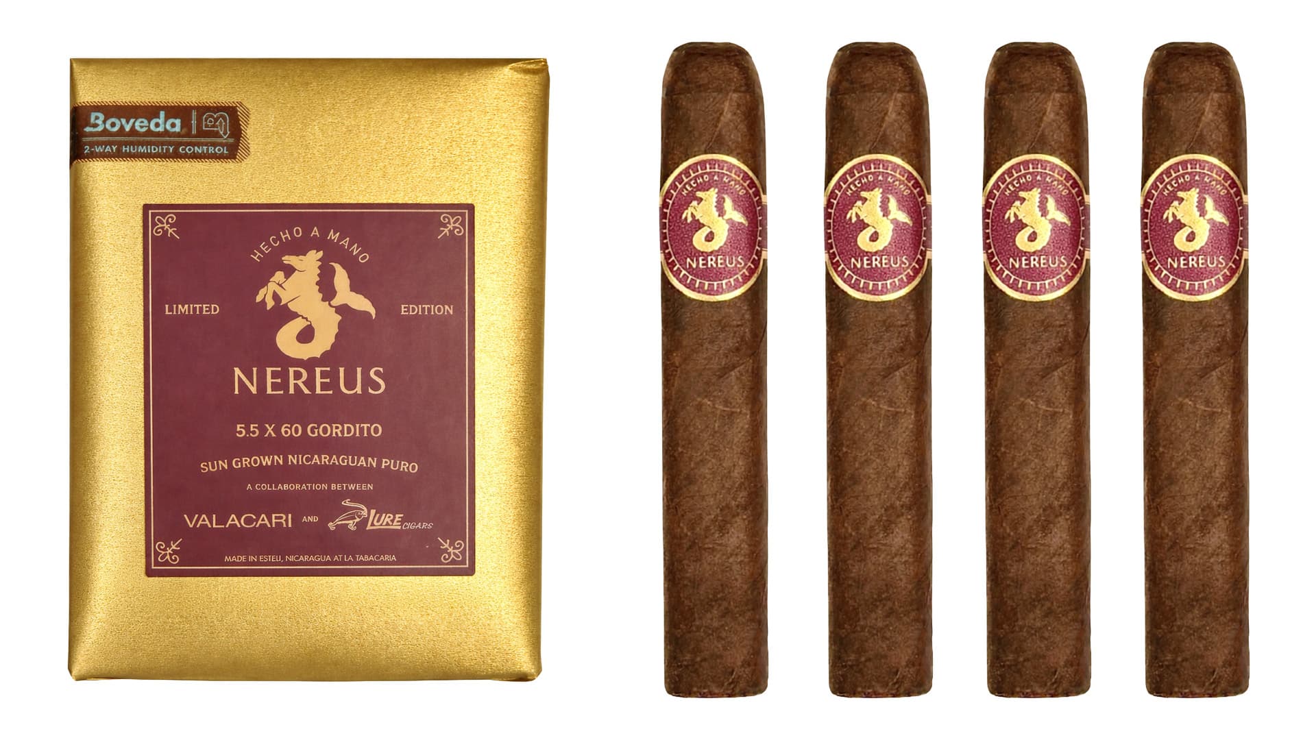 Nereus is produced as a soft box-pressed gordito measuring 5.5 x 60 and is rolled entirely with Nicaraguan tobacco. The cigar features a sun-grown Habano wrapper from Estelรญ, an Estelรญ binder, and five-year-aged fillers from Estelรญ and Condega. Flavor notes listed by the company include coffee, leather, baking spices, and light white pepper on the retrohale.