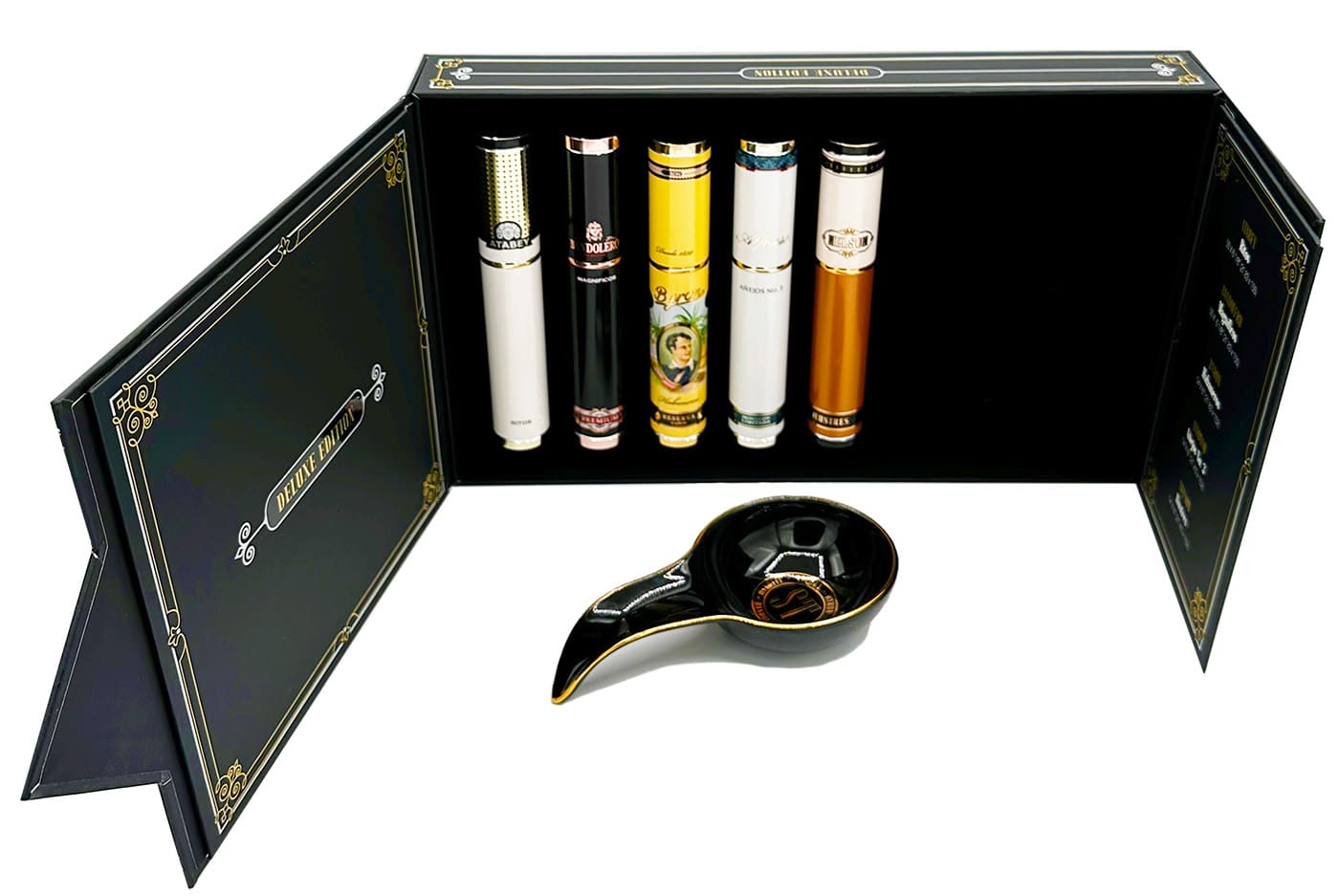 - Packaging: Individual tubes + porcelain ashtray with gold accents
